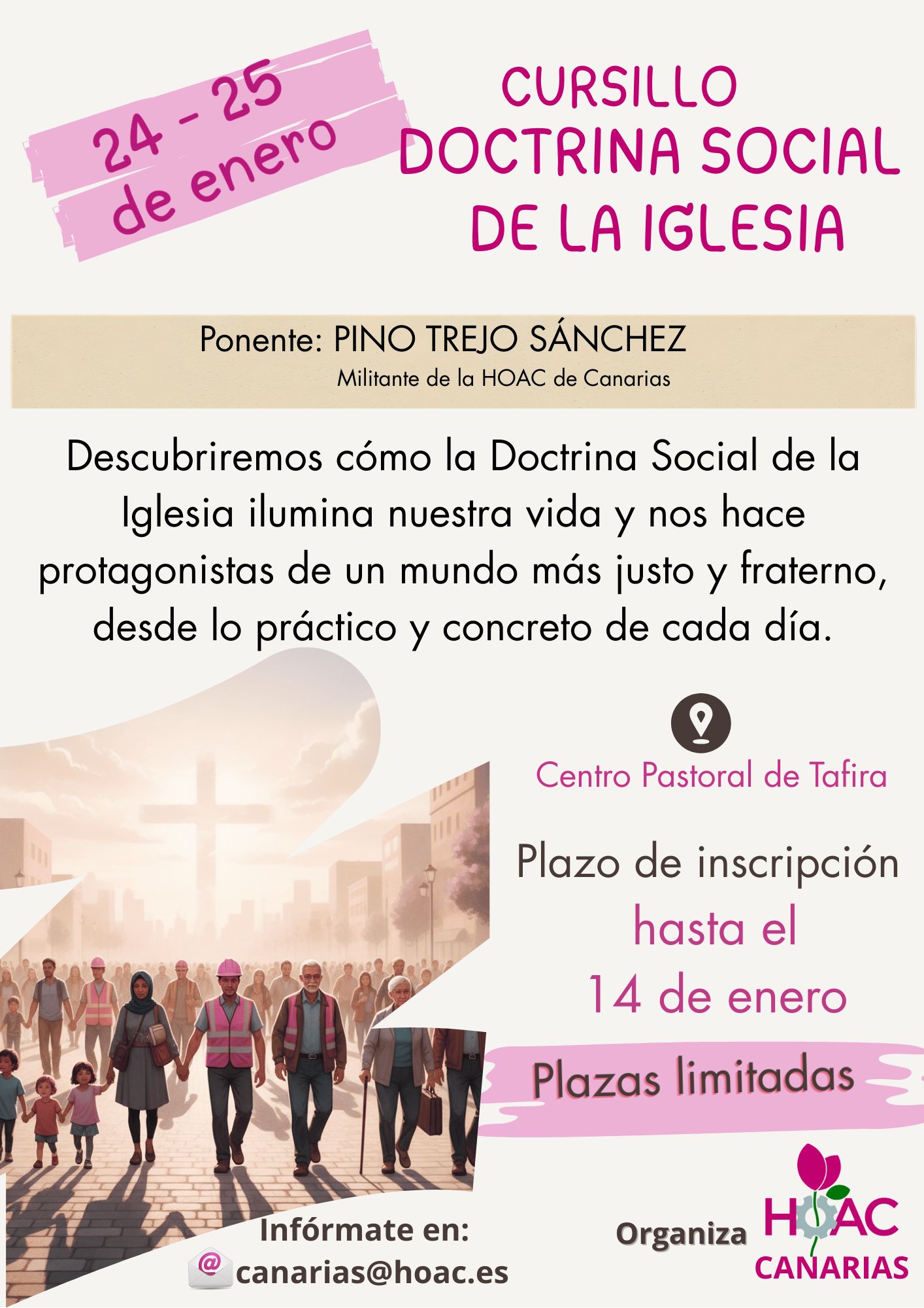 Asimismo, la HOAC ofrece un cursillo sobre Doctrina Social de la Iglesia, que tendrá lugar los días 24 y 25 de enero en el Centro Pastoral de Tafira.
