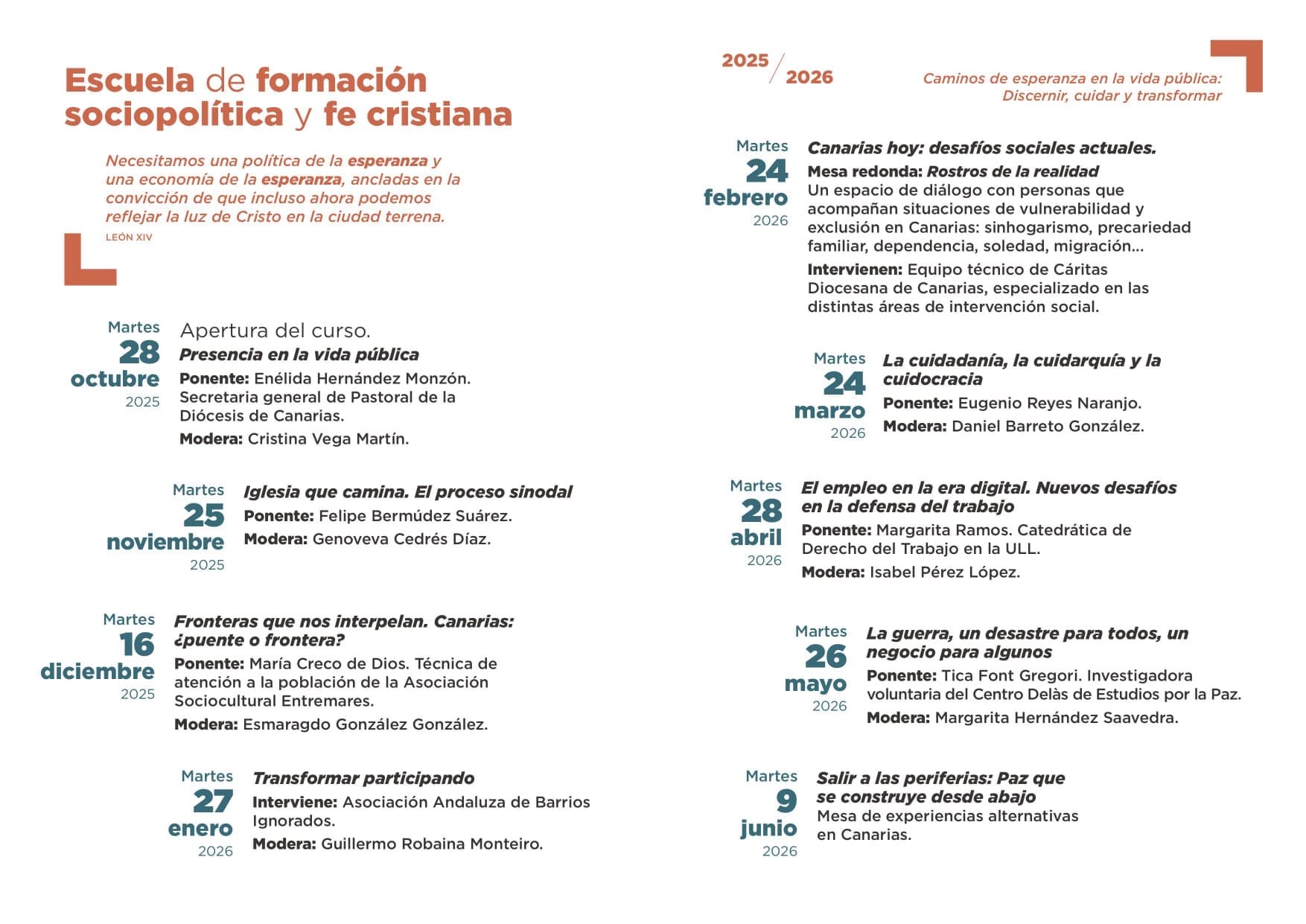 La inauguración del curso tendrá lugar el martes 28 de octubre, a las 19.00 horas, en la Casa de la Iglesia. El acto contará con la intervención de Enélida Hernández, secretaria general de Pastoral de la diócesis de Canarias, quien ofrecerá una reflexión sobre la presencia cristiana en la vida pública.