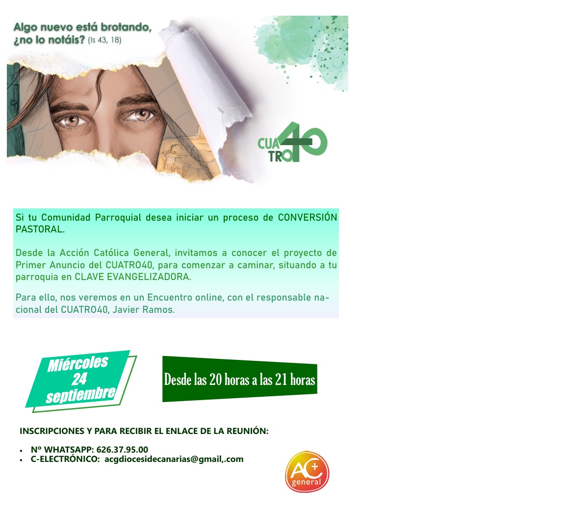 Si tu comunidad parroquial desea iniciar un proceso de conversión pastoral. Desde la Acción Católica General, invitamos a conocer el proyecto de Primer Anuncio del CUATRO40, para comenzar a caminar, situando a tu parroquia en CLAVE EVANGELIZADORA. Para ello, nos veremos en un Encuentro online, con el responsable nacional del CUATRO40, Javier Ramos. Será el miércoles 24 de septiembre a las 20.00 horas.
