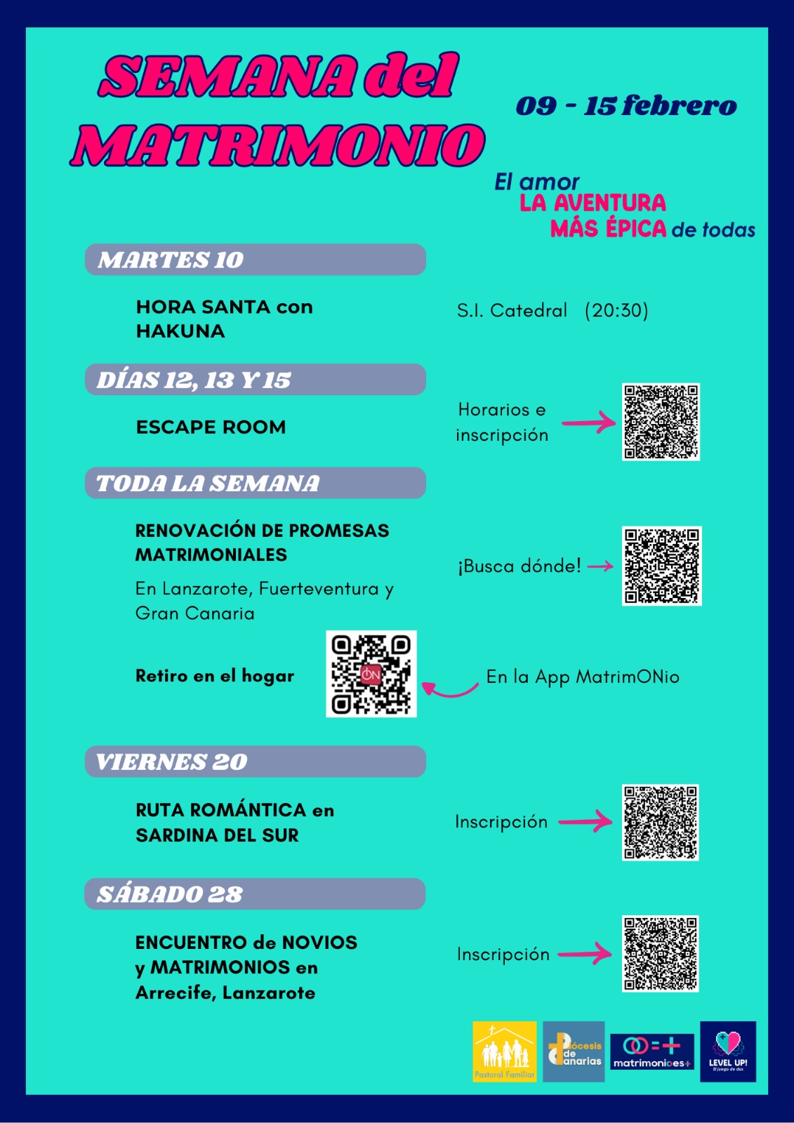 Dentro del marco de la Semana del Matrimonio, se ha organizado también un Retiro para novios y matrimonios en Arrecife (Lanzarote). Tendrá lugar el sábado 28 de febrero, en el Colegio de las Nazarenas, y será una oportunidad privilegiada para profundizar en la fe, el amor y la llamada al matrimonio cristiano.