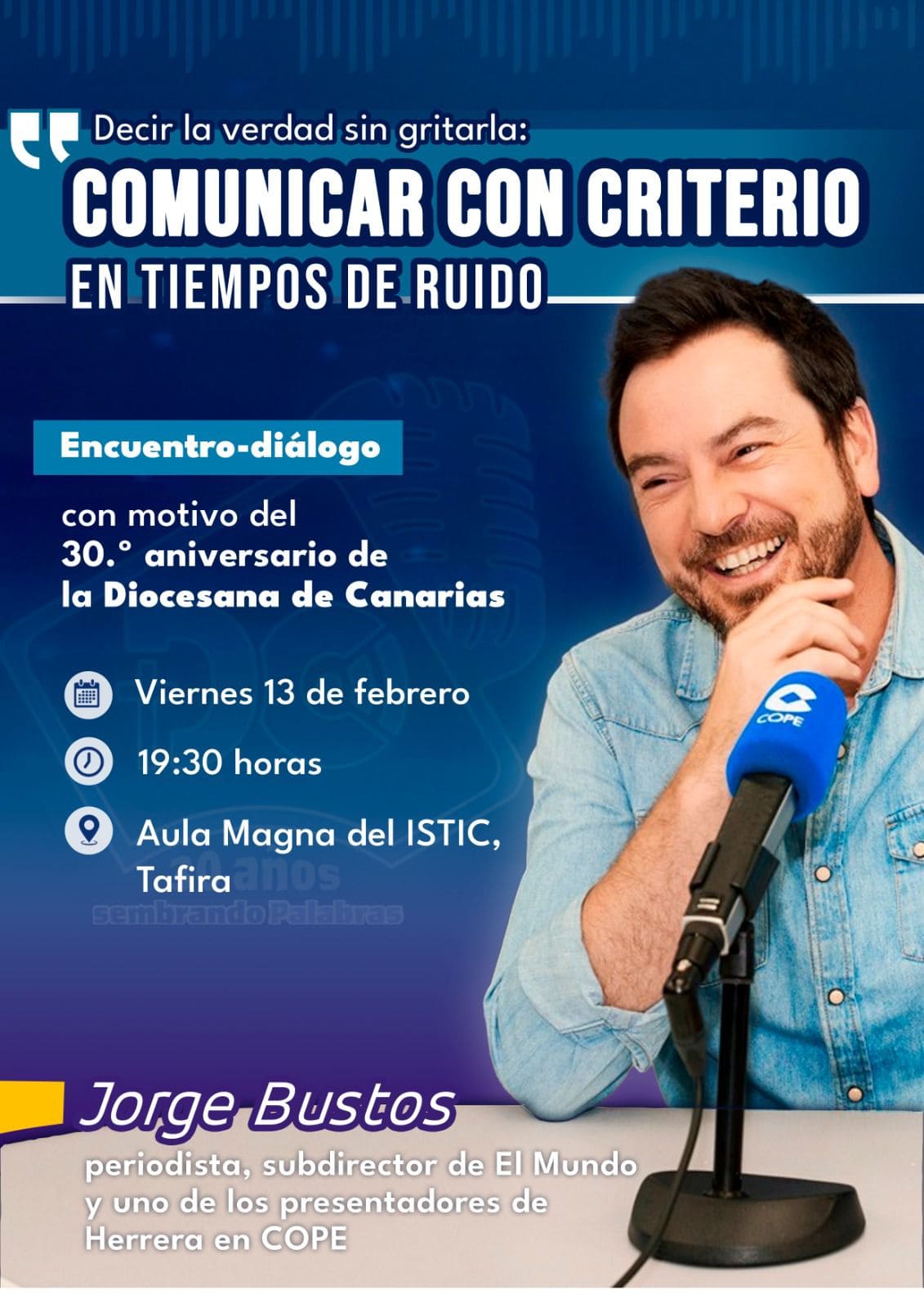 En el marco de los actos conmemorativos del 30 aniversario de la Diocesana de Canarias, el viernes 13 de febrero, a las 19.30 horas, el ISTIC (Tafira) acogerá el encuentro “Diálogo con Jorge Bustos”, presentador de Herrera en COPE y subdirector del diario El Mundo. Bajo el título “Decir la verdad sin gritarla: comunicar con criterio en tiempos de ruido”, la sesión propondrá una reflexión serena sobre el uso de la palabra y la responsabilidad de comunicar con verdad y prudencia. Un diálogo sobre qué exige hoy comunicar bien desde una institución llamada a servir, no a imponerse.
