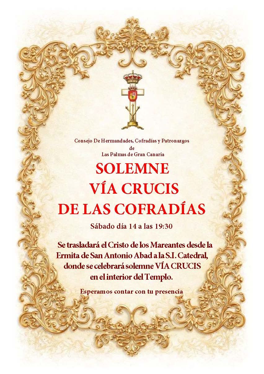 El Consejo de Hermandades, Cofradías y Patronazgos de Las Palmas de Gran Canaria celebrará el Solemne Vía Crucis de las Cofradías el sábado 14 de marzo a las 19:30 horas.