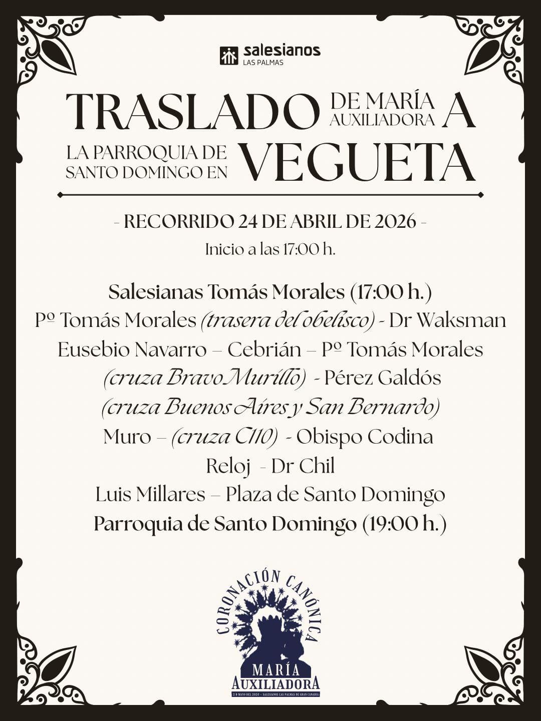 El traslado de María Auxiliadora hacia Vegueta se celebrará finalmente desde el colegio de las Salesianas de Tomás Morales. La procesión partirá este viernes 24 de abril a las 17:00 h y concluirá en la Parroquia de Santo Domingo, donde se espera la llegada en torno a las 19:00 h.