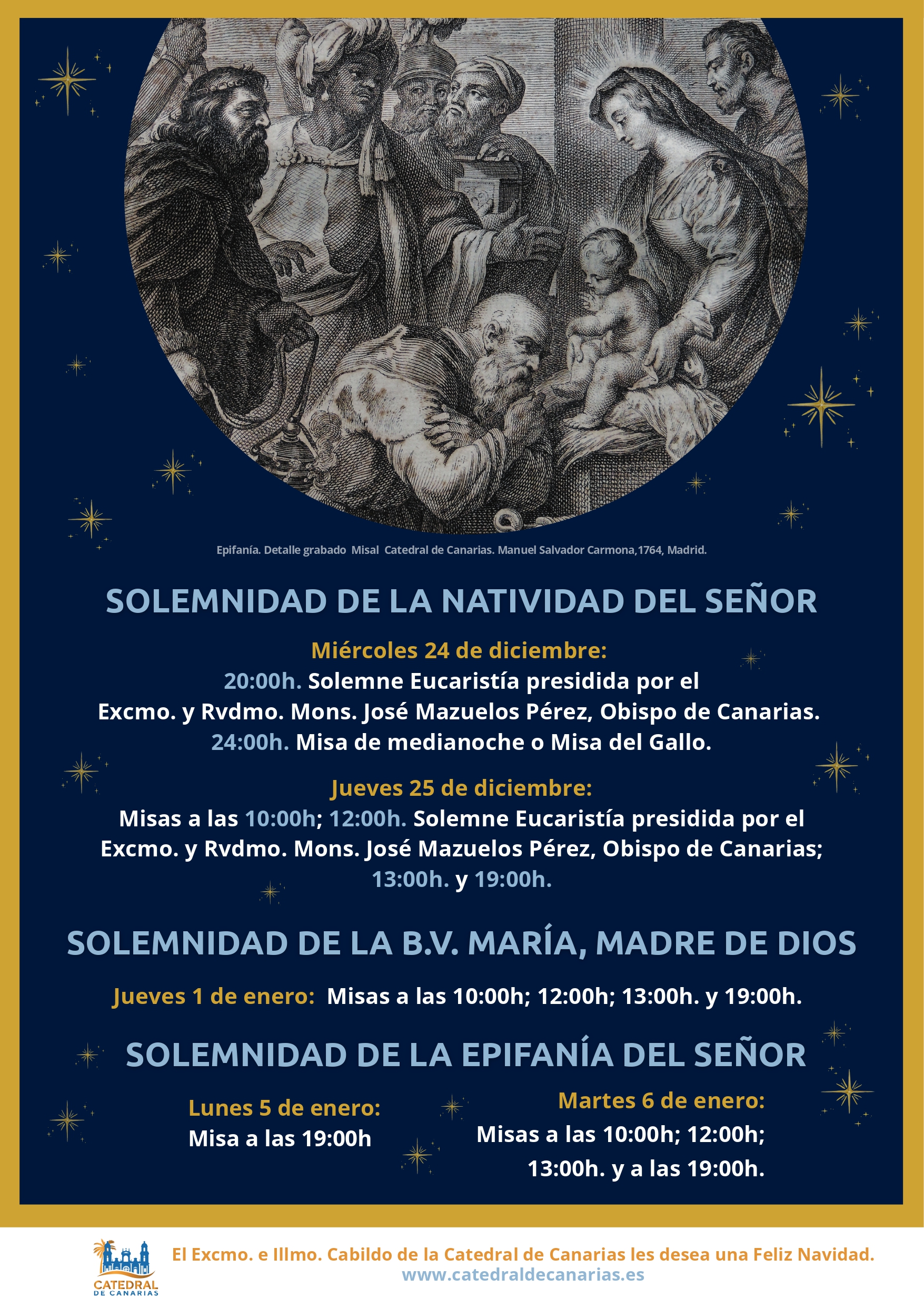 La Catedral de Canarias da a conocer los horarios de las celebraciones litúrgicas con motivo de la Navidad, la solemnidad de la Natividad del Señor, Santa María Madre de Dios y la Epifanía del Señor.