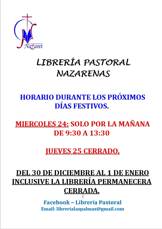 La Librería Pastoral Nazarenas ha informado sobre su horario de atención durante los próximos días festivos.