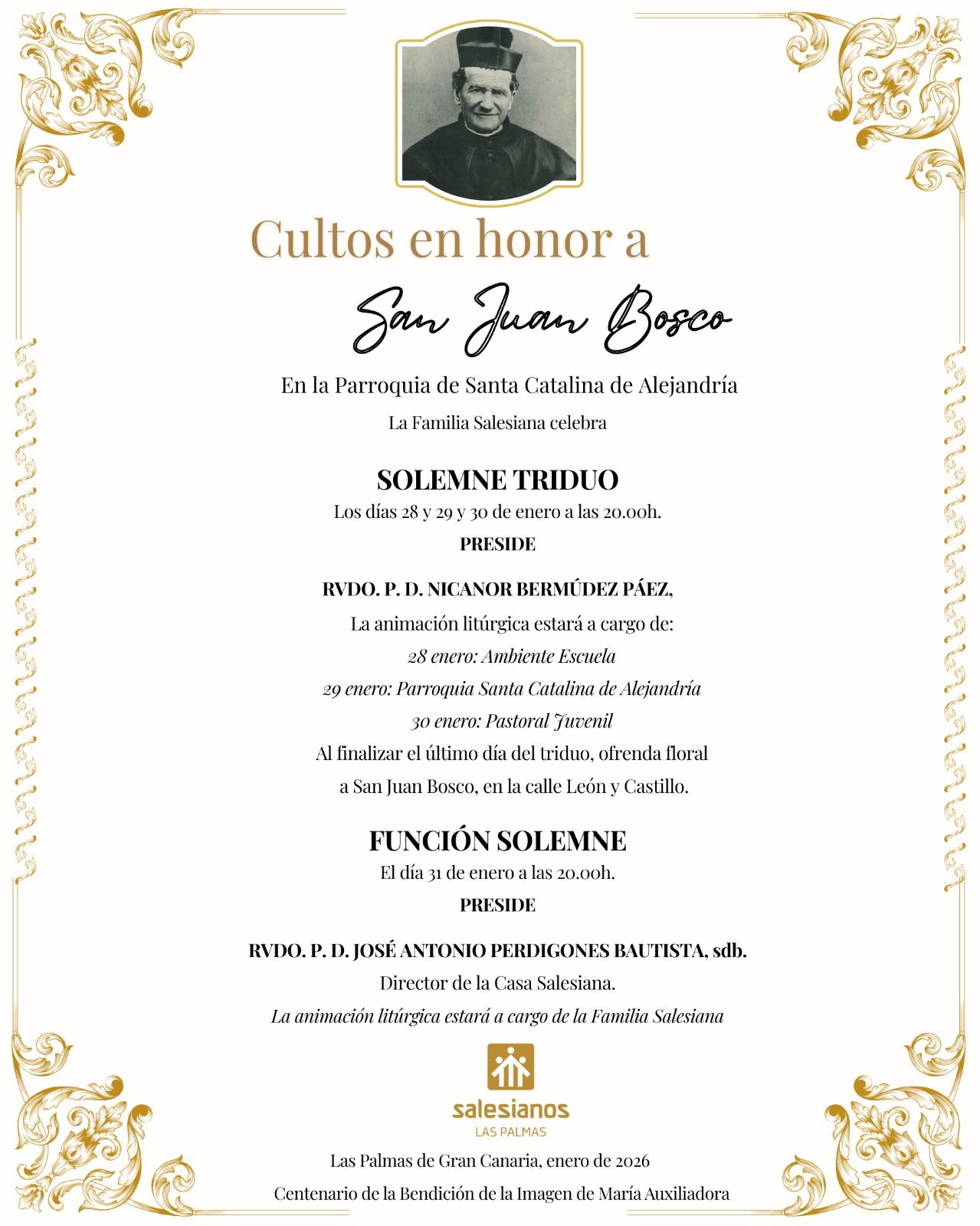 La familia Salesiana ha celebrado un solemne triduo en honor a San Juan Bosco los días 28, 29 y 30 de enero en la parroquia de Santa Catalina de Alejandría. El triduo ha sido presidido por el sacerdote Nicanor Bermúdez Páez.