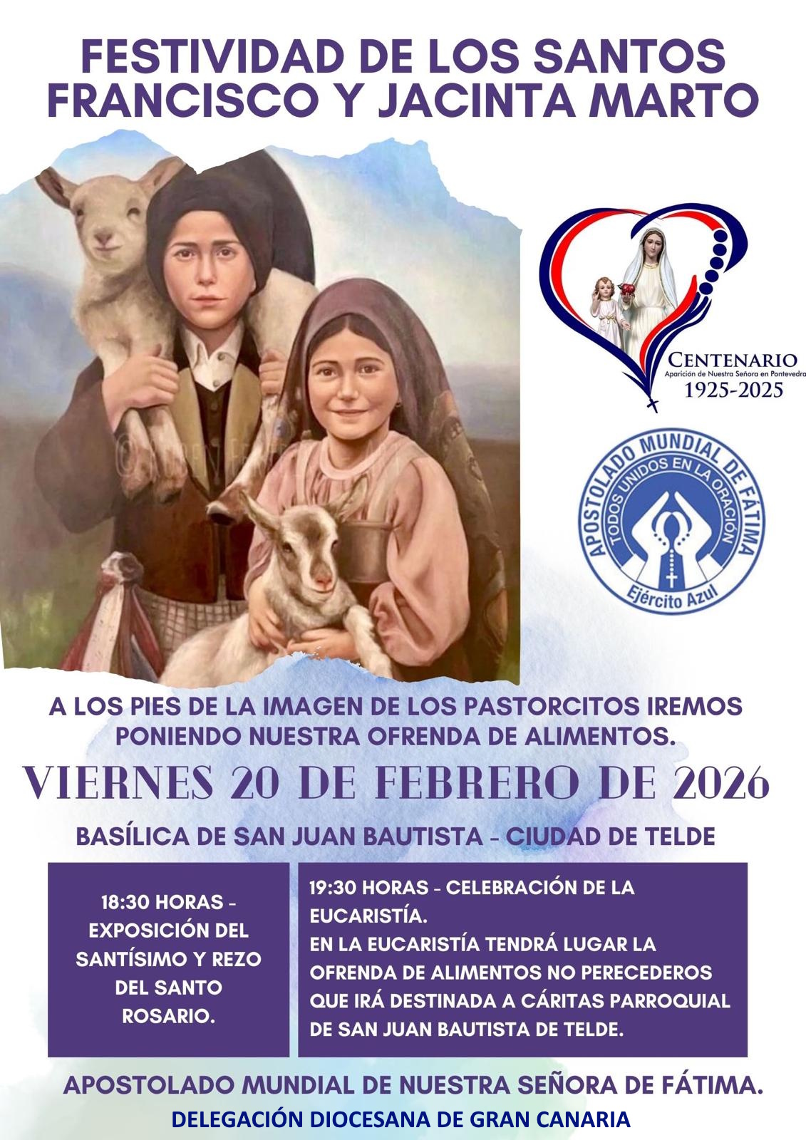 La Delegación Diocesana de Gran Canaria del Apostolado Mundial de Nuestra Señora de Fátima celebrará el 20 de febrero la festivifdad de los santos Francisco y Jacinta Marto.