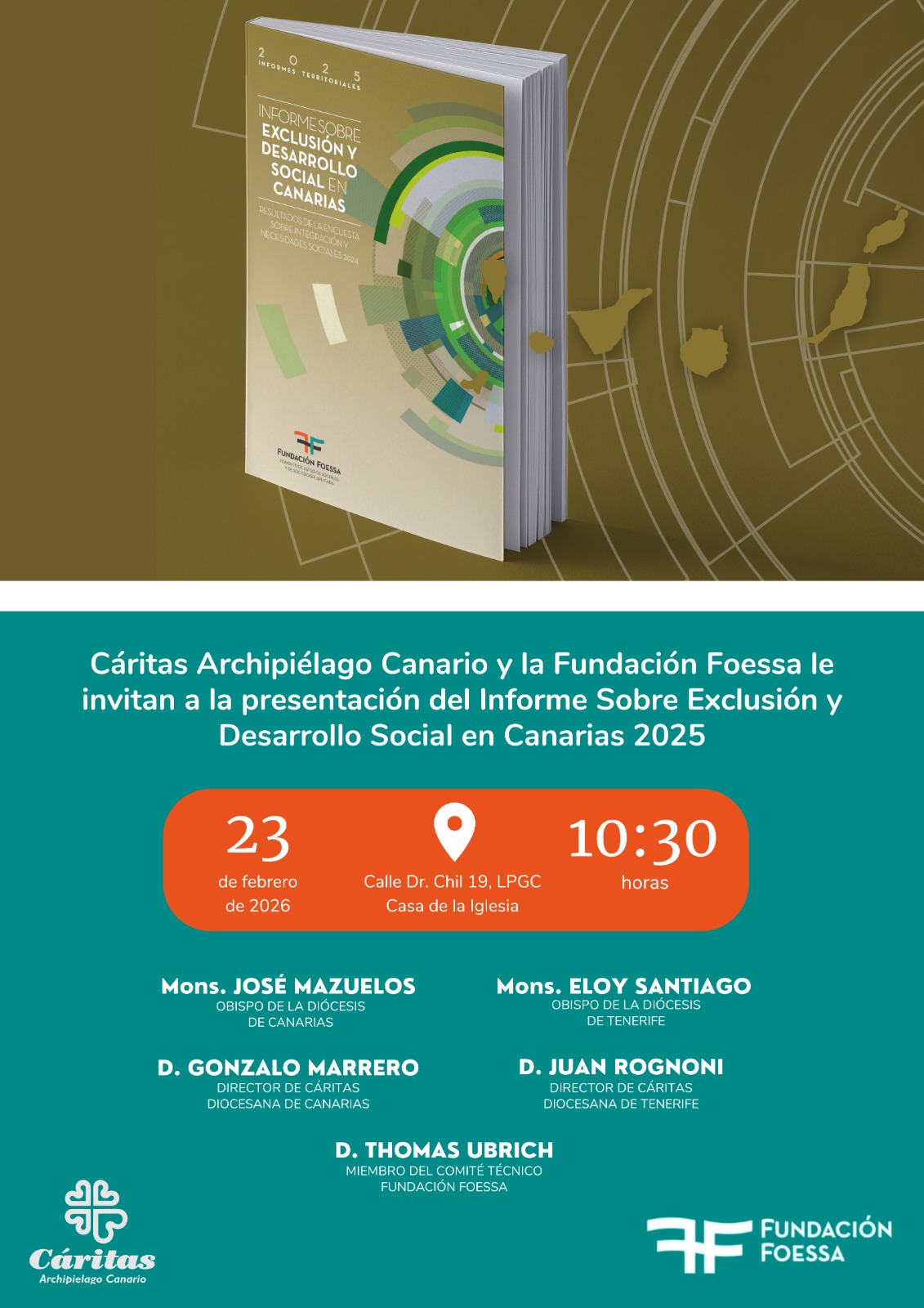 Al acto asistirán Mons. José Mazuelos, Obispo de la Diócesis de Canarias, Mons. Eloy Santiago, Obispo de la Diócesis de Tenerife, Gonzalo Marrero, Director de Cáritas Diocesana de Canarias, Juan Rognoni, Director de Cáritas Tenerife, y Thomas Ubrich, miembro del Comité Técnico de Fundación Foessa.