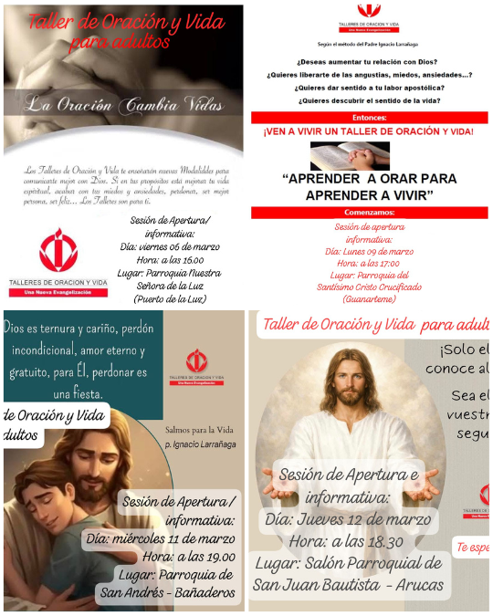 El 6 de marzo tendrá lugar la sesión de apertura en la parroquia de Nuestra Señora de la Luz, en Puerto de la Luz. Por su parte, en el barrio de Guanarteme, las sesiones se iniciarán el 9 de marzo a las 17:00 horas en la parroquia del Santísimo Cristo Crucificado. En la parroquia de San Andrés, en Bañaderos, las sesiones darán inicio el miércoles 11 de marzo a las 19:00 horas. Asimismo, en Arucas, comenzarán el 12 de marzo a las 18:30 horas en el salón parroquial de San Juan Bautista.