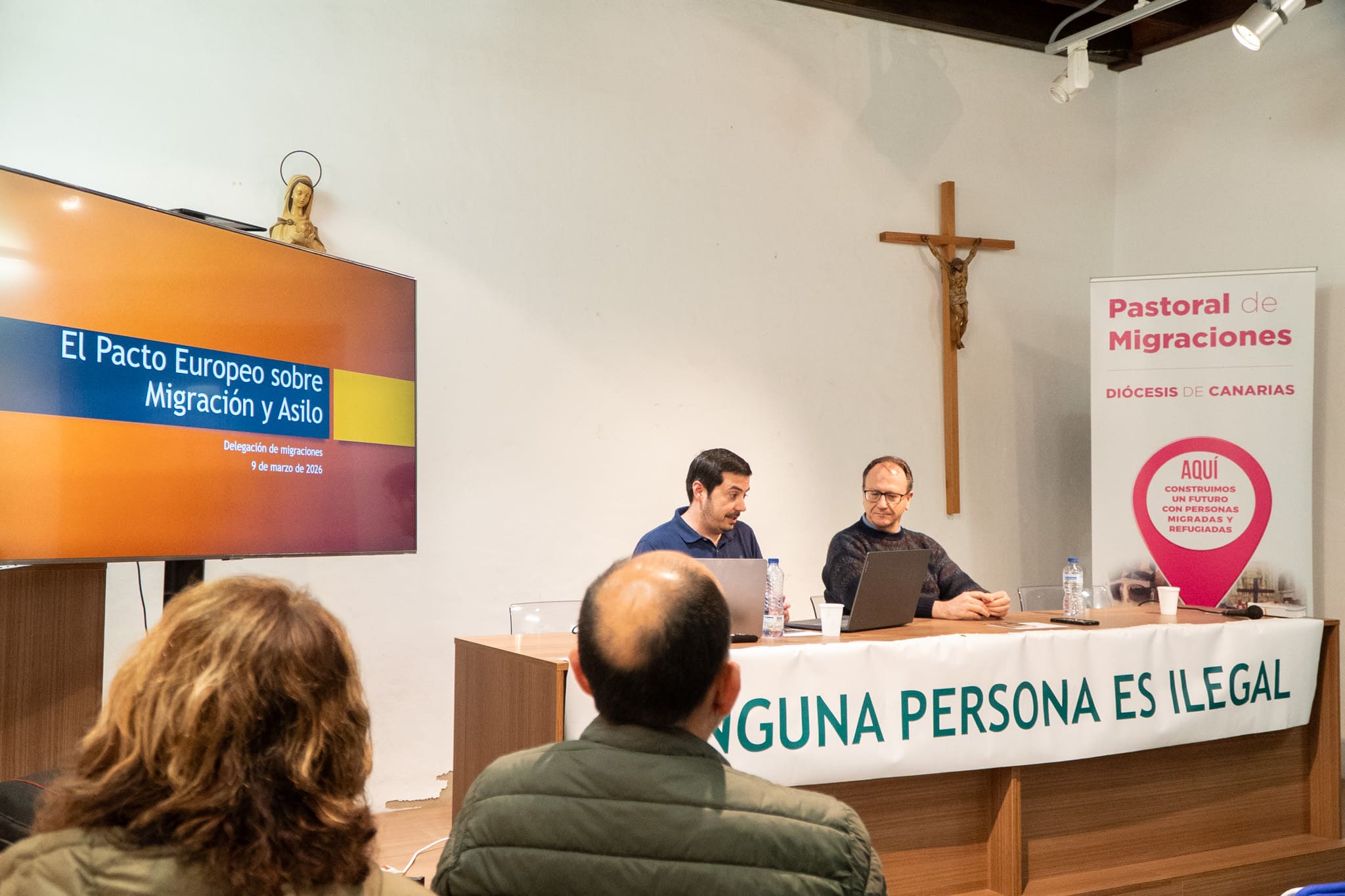 El acto contó con la participación del sacerdote jesuita Josep Buades, encargado de moderar y presentar la sesión, y de David Melián, abogado experto en derecho de extranjería, quien realizó la ponencia técnica. Juntos analizaron los pilares del Pacto Europeo —como los sistemas de identificación (screening) y la "solidaridad flexible"—, aportando una mirada analítica sobre cómo estos reglamentos de gestión de crisis y procedimientos de asilo pueden condicionar el acceso real a la protección internacional y la acogida en nuestras fronteras.