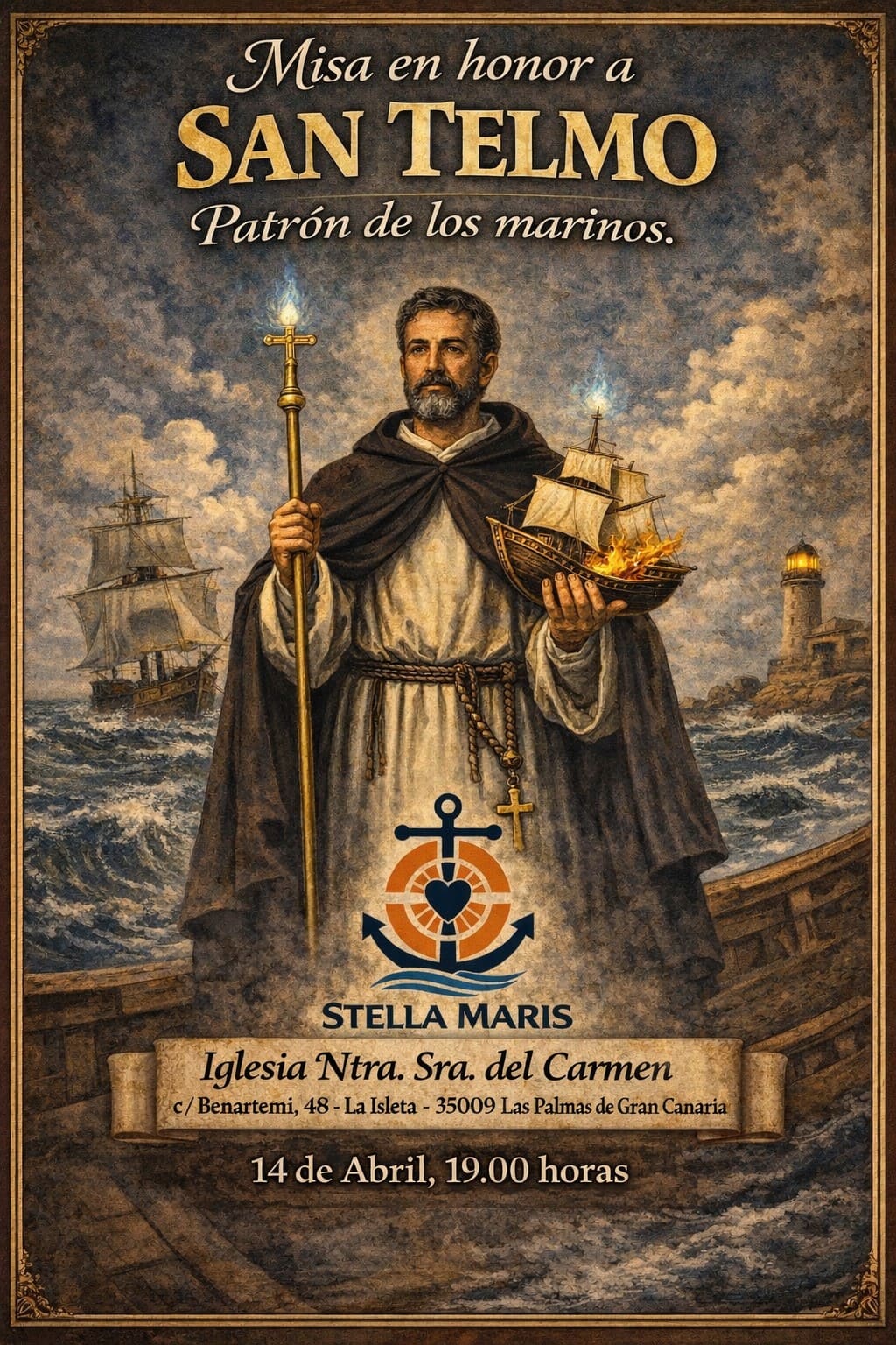 La Delegación de Stella Maris (Apostolado del Mar) organiza una Eucaristía en honor a San Telmo, patrón de los marinos y navegantes, que se celebrará el martes 14 de abril a las 19:00 h en la Parroquia de Nuestra Señora del Carmen, en La Isleta.