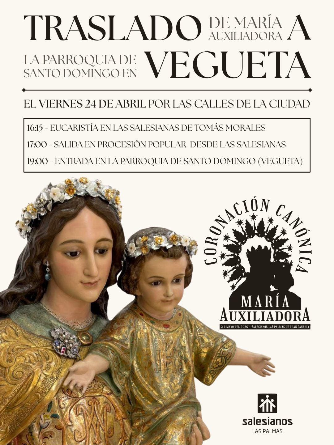 El traslado de María Auxiliadora hacia Vegueta se celebrará finalmente desde el colegio de las Salesianas de Tomás Morales. La procesión partirá este viernes 24 de abril a las 17:00 h y concluirá en la Parroquia de Santo Domingo, donde se espera la llegada en torno a las 19:00 h.