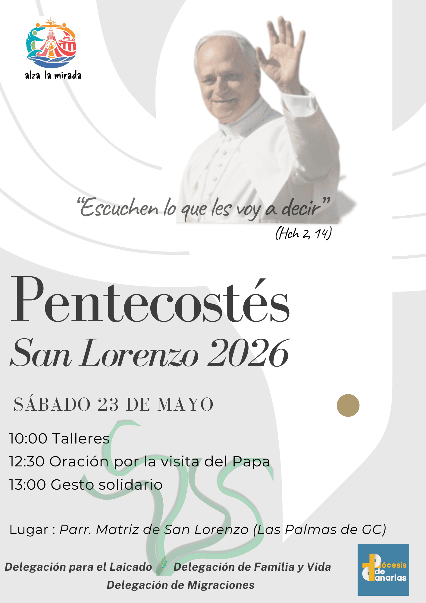 El sábado 23 de mayo tendrá lugar el encuentro diocesano de Pentecostés, en la Parroquia matriz de San Lorenzo, de 10:00 a 13:00 h. La delegación para el Laicado, la delegación de Familia y Vida y la delegación de Migraciones de la Diócesis de Canarias invitan a participar en este espacio, que será, además, una buena oportunidad para la preparación personal y comunitaria de la visita del Papa a las Islas pocos días después. Constará de dos rutas de talleres, una oración por los frutos del viaje apostólico de León XIV a nuestra diócesis y de un gesto solidario.